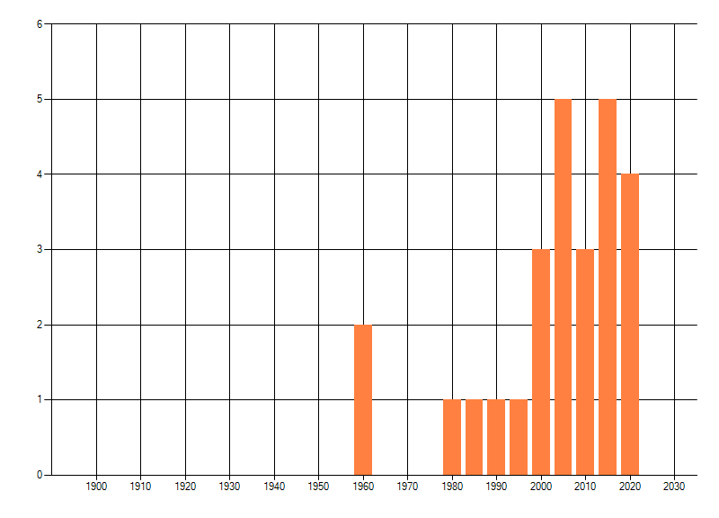 Het aantal atlasblokken (5x5 km) waarin de soort is gemeld binnen een periode van vijf jaar (vanaf 1980) of twintig jaar. Niet gecorrigeerd voor waarnemersinspanning en het aantal doorgegeven waarnemingen kan sterk variëren per periode, dus een trend in verspreiding kan hier niet direct uit worden afgelezen. Het opgegeven jaartal is het eerste jaar van de periode. Bron: gevalideerde waarnemingen uit de NDFF.