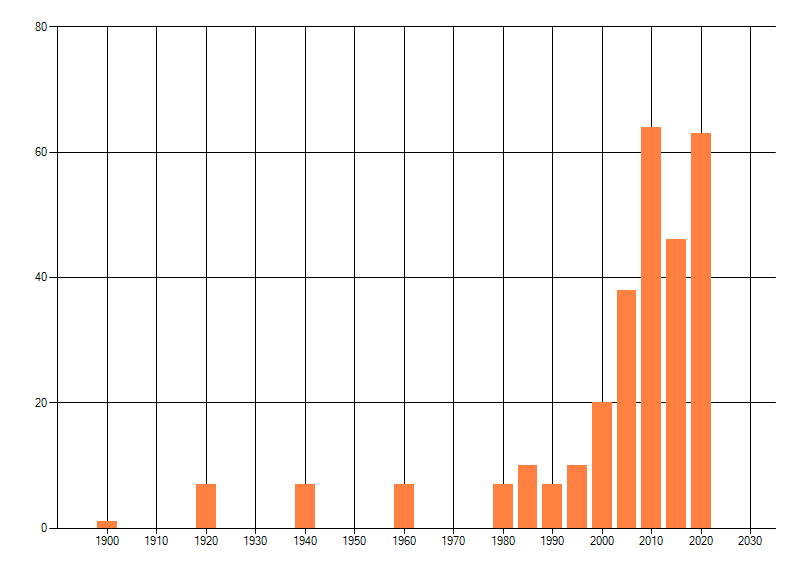 Het aantal atlasblokken (5x5 km) waarin de soort is gemeld binnen een periode van vijf jaar (vanaf 1980) of twintig jaar. Niet gecorrigeerd voor waarnemersinspanning en het aantal doorgegeven waarnemingen kan sterk variëren per periode, dus een trend in verspreiding kan hier niet direct uit worden afgelezen. Het opgegeven jaartal is het eerste jaar van de periode. Bron: gevalideerde waarnemingen uit de NDFF.