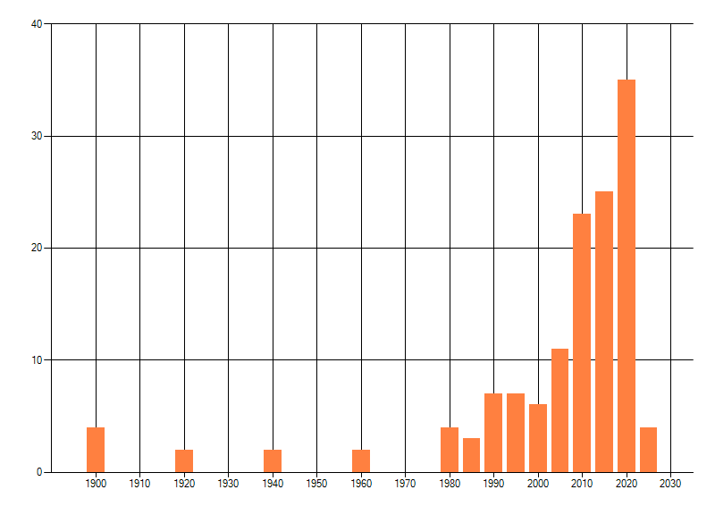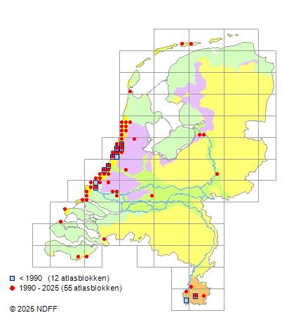 Het aantal atlasblokken (5x5 km) waarin de soort is gemeld binnen een periode van vijf jaar (vanaf 1980) of twintig jaar. Niet gecorrigeerd voor waarnemersinspanning en het aantal doorgegeven waarnemingen kan sterk variëren per periode, dus een trend in verspreiding kan hier niet direct uit worden afgelezen. Het opgegeven jaartal is het eerste jaar van de periode. Bron: gevalideerde waarnemingen uit de NDFF.