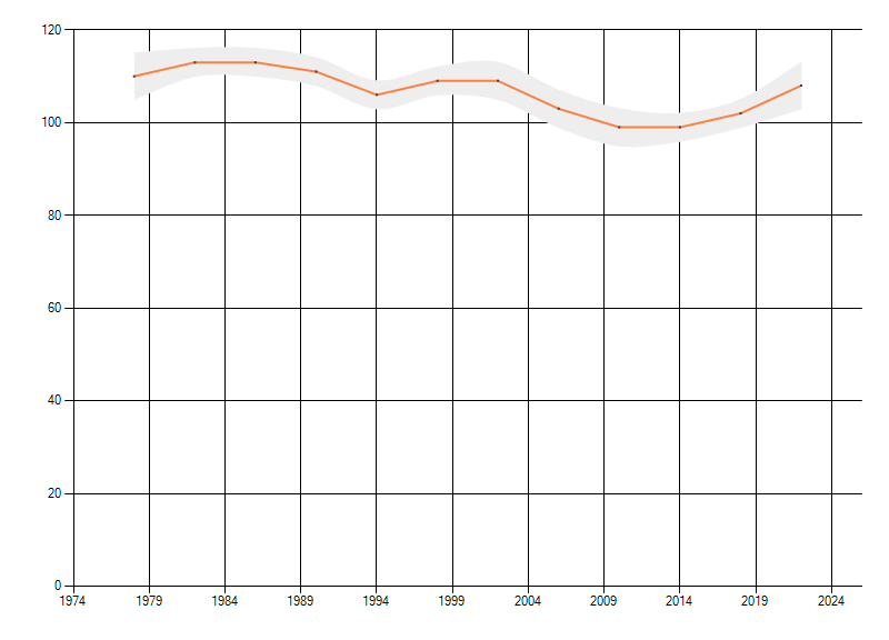 Gemiddelde trend van het aantal kilometerhokken waarin de soort voorkomt, weergegeven als indexcijfer (1975-1978 = 100).
