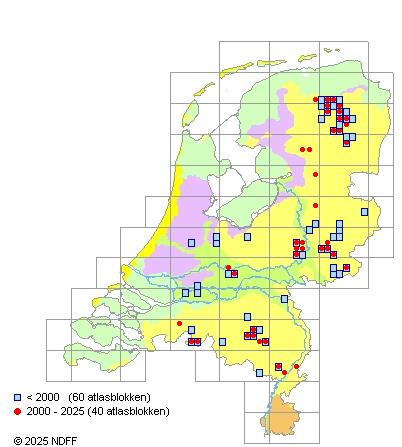 Het aantal atlasblokken (5x5 km) waarin de soort is gemeld binnen een periode van vijf jaar (vanaf 1980) of twintig jaar.