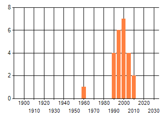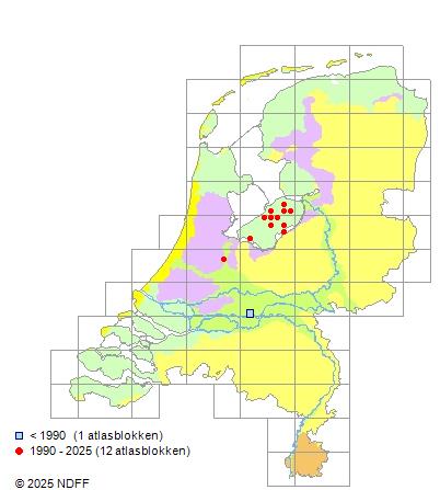 Het aantal atlasblokken (5x5 km) waarin de soort is gemeld binnen een periode van vijf jaar (vanaf 1980) of twintig jaar. Niet gecorrigeerd voor waarnemersinspanning en het aantal doorgegeven waarnemingen kan sterk variëren per periode, dus een trend in verspreiding kan hier niet direct uit worden afgelezen. Het opgegeven jaartal is het eerste jaar van de periode. Bron: gevalideerde waarnemingen uit de NDFF.
