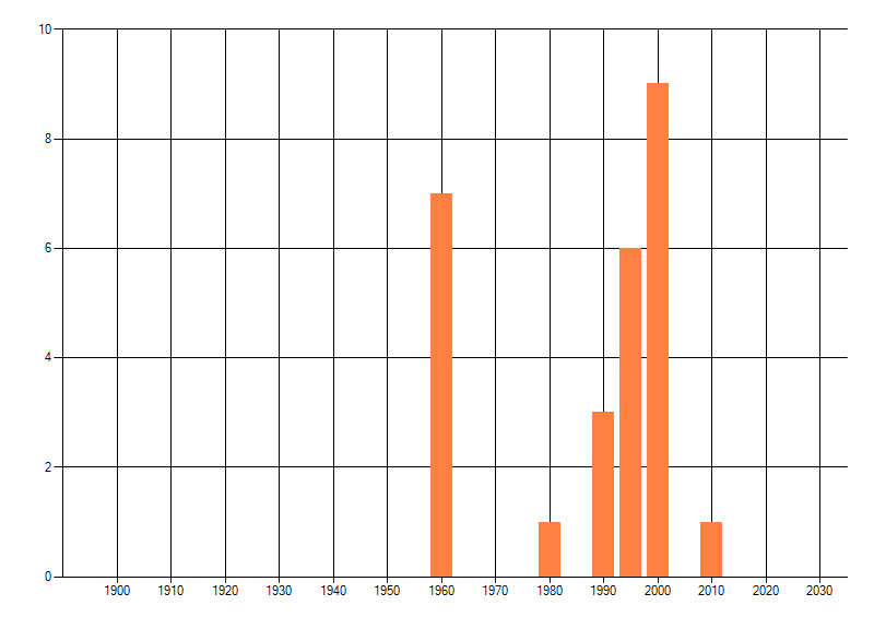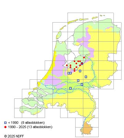 Het aantal atlasblokken (5x5 km) waarin de soort is gemeld binnen een periode van vijf jaar (vanaf 1980) of twintig jaar. Niet gecorrigeerd voor waarnemersinspanning en het aantal doorgegeven waarnemingen kan sterk variëren per periode, dus een trend in verspreiding kan hier niet direct uit worden afgelezen. Het opgegeven jaartal is het eerste jaar van de periode. Bron: gevalideerde waarnemingen uit de NDFF.