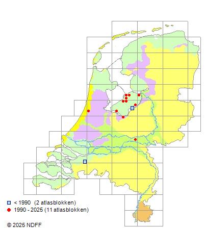 Het aantal atlasblokken (5x5 km) waarin de soort is gemeld binnen een periode van vijf jaar (vanaf 1980) of twintig jaar. Niet gecorrigeerd voor waarnemersinspanning en het aantal doorgegeven waarnemingen kan sterk variëren per periode, dus een trend in verspreiding kan hier niet direct uit worden afgelezen. Het opgegeven jaartal is het eerste jaar van de periode. Bron: gevalideerde waarnemingen uit de NDFF.