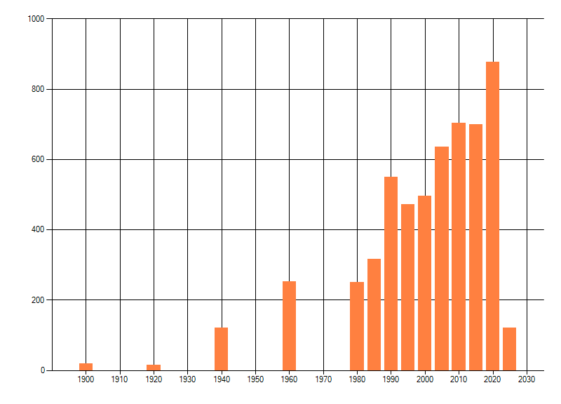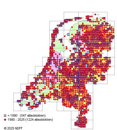 Het aantal atlasblokken (5x5 km) waarin de soort is gemeld binnen een periode van vijf jaar (vanaf 1980) of twintig jaar. Niet gecorrigeerd voor waarnemersinspanning en het aantal doorgegeven waarnemingen kan sterk variëren per periode, dus een trend in verspreiding kan hier niet direct uit worden afgelezen. Het opgegeven jaartal is het eerste jaar van de periode. Bron: gevalideerde waarnemingen uit de NDFF.