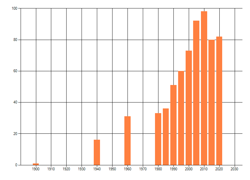 Het aantal atlasblokken (5x5 km) waarin de soort is gemeld binnen een periode van vijf jaar (vanaf 1980) of twintig jaar. Niet gecorrigeerd voor waarnemersinspanning en het aantal doorgegeven waarnemingen kan sterk variëren per periode, dus een trend in verspreiding kan hier niet direct uit worden afgelezen. Het opgegeven jaartal is het eerste jaar van de periode. Bron: gevalideerde waarnemingen uit de NDFF.