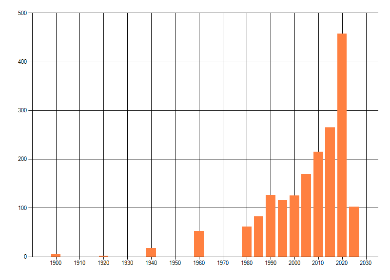 Het aantal atlasblokken (5x5 km) waarin de soort is gemeld binnen een periode van vijf jaar (vanaf 1980) of twintig jaar. Niet gecorrigeerd voor waarnemersinspanning en het aantal doorgegeven waarnemingen kan sterk variëren per periode, dus een trend in verspreiding kan hier niet direct uit worden afgelezen. Het opgegeven jaartal is het eerste jaar van de periode. Bron: gevalideerde waarnemingen uit de NDFF.
