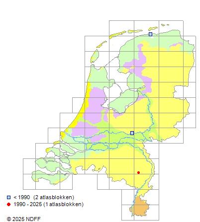 Het aantal atlasblokken (5x5 km) waarin de soort is gemeld binnen een periode van vijf jaar (vanaf 1980) of twintig jaar. Niet gecorrigeerd voor waarnemersinspanning en het aantal doorgegeven waarnemingen kan sterk variëren per periode, dus een trend in verspreiding kan hier niet direct uit worden afgelezen. Het opgegeven jaartal is het eerste jaar van de periode. Bron: gevalideerde waarnemingen uit de NDFF.
