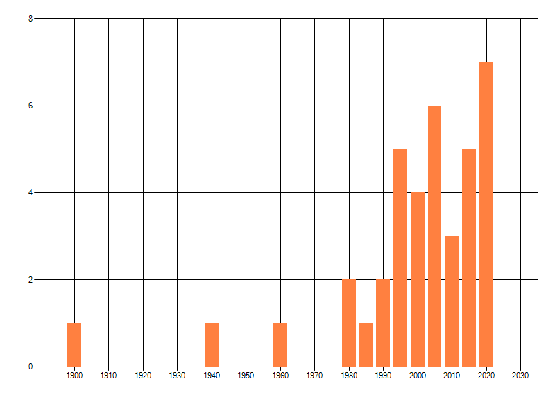 Het aantal atlasblokken (5x5 km) waarin de soort is gemeld binnen een periode van vijf jaar (vanaf 1980) of twintig jaar. Niet gecorrigeerd voor waarnemersinspanning en het aantal doorgegeven waarnemingen kan sterk variëren per periode, dus een trend in verspreiding kan hier niet direct uit worden afgelezen. Het opgegeven jaartal is het eerste jaar van de periode. Bron: gevalideerde waarnemingen uit de NDFF.