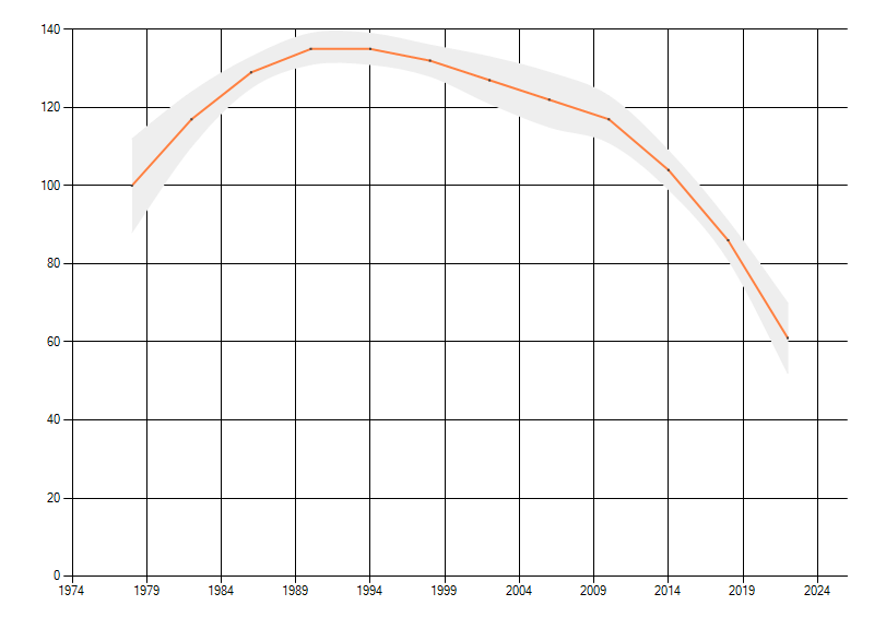 Gemiddelde trend van het aantal kilometerhokken waarin de soort voorkomt, weergegeven als indexcijfer (1975-1978 = 100).
