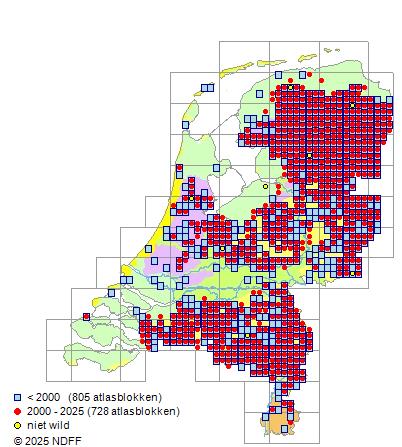 CC BY-NC-SA 3.0 NLVerspreidingNederlandPlaatselijk vrij algemeen in het oosten en midden van het land en in laagveengebieden en zeer zeldzaam in het rivierengebied en op Vlieland.