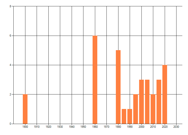 Het aantal atlasblokken (5x5 km) waarin de soort is gemeld binnen een periode van vijf jaar (vanaf 1980) of twintig jaar. Niet gecorrigeerd voor waarnemersinspanning en het aantal doorgegeven waarnemingen kan sterk variëren per periode, dus een trend in verspreiding kan hier niet direct uit worden afgelezen. Het opgegeven jaartal is het eerste jaar van de periode. Bron: gevalideerde waarnemingen uit de NDFF.