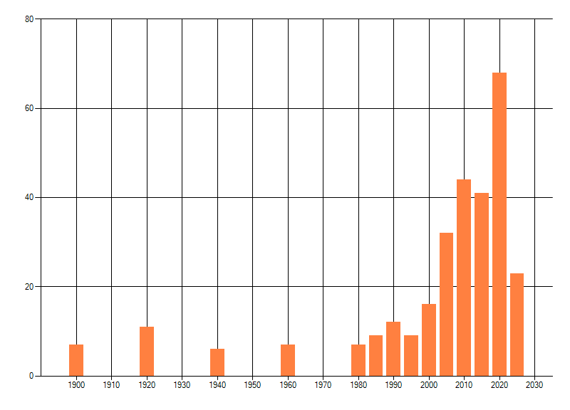 Het aantal atlasblokken (5x5 km) waarin de soort is gemeld binnen een periode van vijf jaar (vanaf 1980) of twintig jaar. Niet gecorrigeerd voor waarnemersinspanning en het aantal doorgegeven waarnemingen kan sterk variëren per periode, dus een trend in verspreiding kan hier niet direct uit worden afgelezen. Het opgegeven jaartal is het eerste jaar van de periode. Bron: gevalideerde waarnemingen uit de NDFF.