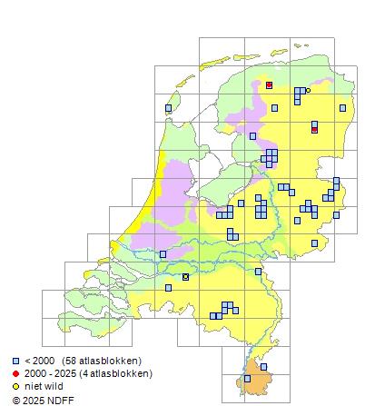 Het aantal atlasblokken (5x5 km) waarin de soort is gemeld binnen een periode van vijf jaar (vanaf 1980) of twintig jaar.