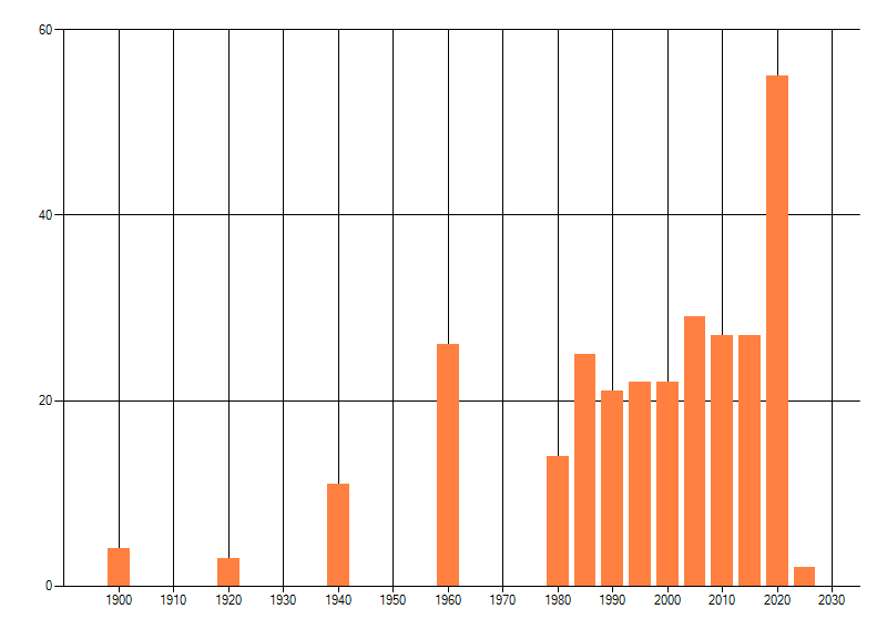 Het aantal atlasblokken (5x5 km) waarin de soort is gemeld binnen een periode van vijf jaar (vanaf 1980) of twintig jaar. Niet gecorrigeerd voor waarnemersinspanning en het aantal doorgegeven waarnemingen kan sterk variëren per periode, dus een trend in verspreiding kan hier niet direct uit worden afgelezen. Het opgegeven jaartal is het eerste jaar van de periode. Bron: gevalideerde waarnemingen uit de NDFF.