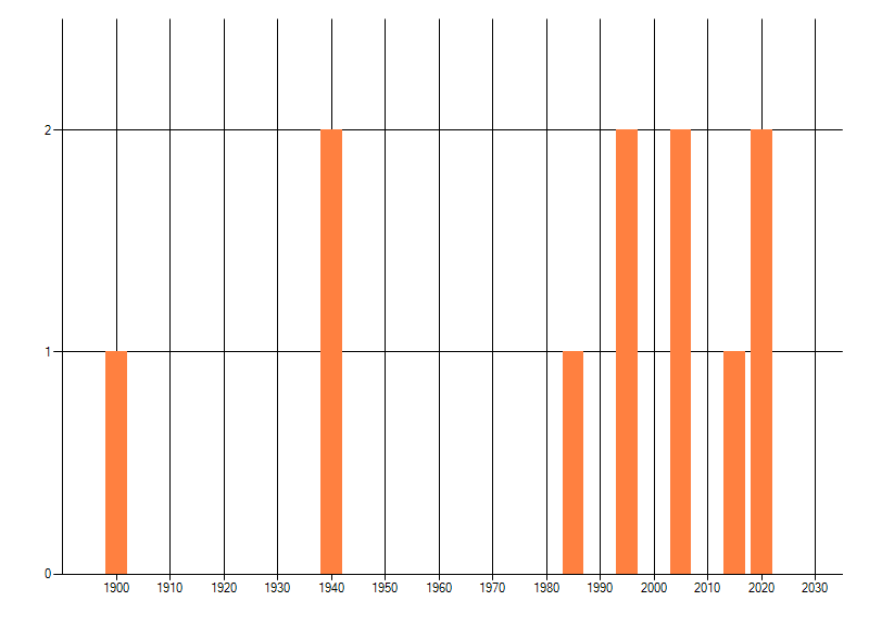 Het aantal atlasblokken (5x5 km) waarin de soort is gemeld binnen een periode van vijf jaar (vanaf 1980) of twintig jaar. Niet gecorrigeerd voor waarnemersinspanning en het aantal doorgegeven waarnemingen kan sterk variëren per periode, dus een trend in verspreiding kan hier niet direct uit worden afgelezen. Het opgegeven jaartal is het eerste jaar van de periode. Bron: gevalideerde waarnemingen uit de NDFF.