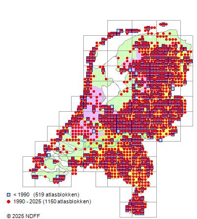 Het aantal atlasblokken (5x5 km) waarin de soort is gemeld binnen een periode van vijf jaar (vanaf 1980) of twintig jaar. Niet gecorrigeerd voor waarnemersinspanning en het aantal doorgegeven waarnemingen kan sterk variëren per periode, dus een trend in verspreiding kan hier niet direct uit worden afgelezen. Het opgegeven jaartal is het eerste jaar van de periode. Bron: gevalideerde waarnemingen uit de NDFF.