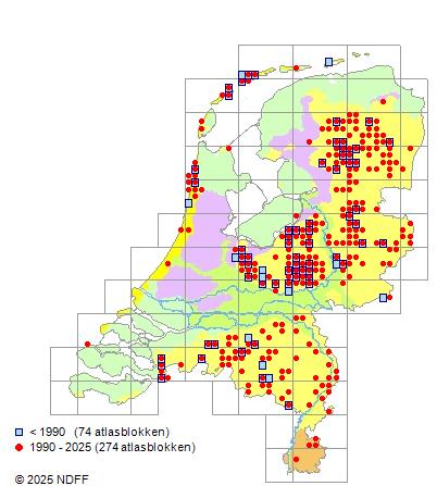 Het aantal atlasblokken (5x5 km) waarin de soort is gemeld binnen een periode van vijf jaar (vanaf 1980) of twintig jaar. Niet gecorrigeerd voor waarnemersinspanning en het aantal doorgegeven waarnemingen kan sterk variëren per periode, dus een trend in verspreiding kan hier niet direct uit worden afgelezen. Het opgegeven jaartal is het eerste jaar van de periode. Bron: gevalideerde waarnemingen uit de NDFF.
