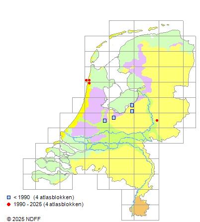 Het aantal atlasblokken (5x5 km) waarin de soort is gemeld binnen een periode van vijf jaar (vanaf 1980) of twintig jaar. Niet gecorrigeerd voor waarnemersinspanning en het aantal doorgegeven waarnemingen kan sterk variëren per periode, dus een trend in verspreiding kan hier niet direct uit worden afgelezen. Het opgegeven jaartal is het eerste jaar van de periode. Bron: gevalideerde waarnemingen uit de NDFF.