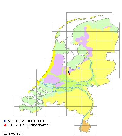 Het aantal atlasblokken (5x5 km) waarin de soort is gemeld binnen een periode van vijf jaar (vanaf 1980) of twintig jaar. Niet gecorrigeerd voor waarnemersinspanning en het aantal doorgegeven waarnemingen kan sterk variëren per periode, dus een trend in verspreiding kan hier niet direct uit worden afgelezen. Het opgegeven jaartal is het eerste jaar van de periode. Bron: gevalideerde waarnemingen uit de NDFF.