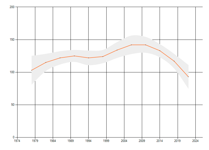 Gemiddelde trend van het aantal kilometerhokken waarin de soort voorkomt, weergegeven als indexcijfer (1975-1978 = 100).