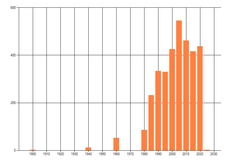Het aantal atlasblokken (5x5 km) waarin de soort is gemeld binnen een periode van vijf jaar (vanaf 1980) of twintig jaar. Niet gecorrigeerd voor waarnemersinspanning en het aantal doorgegeven waarnemingen kan sterk variëren per periode, dus een trend in verspreiding kan hier niet direct uit worden afgelezen. Het opgegeven jaartal is het eerste jaar van de periode. Bron: gevalideerde waarnemingen uit de NDFF.