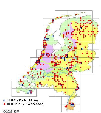 Het aantal atlasblokken (5x5 km) waarin de soort is gemeld binnen een periode van vijf jaar (vanaf 1980) of twintig jaar. Niet gecorrigeerd voor waarnemersinspanning en het aantal doorgegeven waarnemingen kan sterk variëren per periode, dus een trend in verspreiding kan hier niet direct uit worden afgelezen. Het opgegeven jaartal is het eerste jaar van de periode. Bron: gevalideerde waarnemingen uit de NDFF.