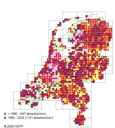 Het aantal atlasblokken (5x5 km) waarin de soort is gemeld binnen een periode van vijf jaar (vanaf 1980) of twintig jaar. Niet gecorrigeerd voor waarnemersinspanning en het aantal doorgegeven waarnemingen kan sterk variëren per periode, dus een trend in verspreiding kan hier niet direct uit worden afgelezen. Het opgegeven jaartal is het eerste jaar van de periode. Bron: gevalideerde waarnemingen uit de NDFF.