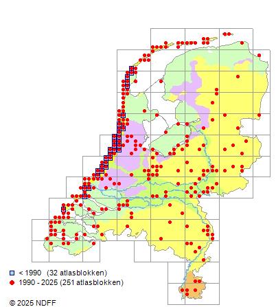 Het aantal atlasblokken (5x5 km) waarin de soort is gemeld binnen een periode van vijf jaar (vanaf 1980) of twintig jaar. Niet gecorrigeerd voor waarnemersinspanning en het aantal doorgegeven waarnemingen kan sterk variëren per periode, dus een trend in verspreiding kan hier niet direct uit worden afgelezen. Het opgegeven jaartal is het eerste jaar van de periode. Bron: gevalideerde waarnemingen uit de NDFF.