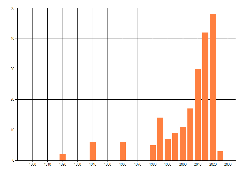 Het aantal atlasblokken (5x5 km) waarin de soort is gemeld binnen een periode van vijf jaar (vanaf 1980) of twintig jaar. Niet gecorrigeerd voor waarnemersinspanning en het aantal doorgegeven waarnemingen kan sterk variëren per periode, dus een trend in verspreiding kan hier niet direct uit worden afgelezen. Het opgegeven jaartal is het eerste jaar van de periode. Bron: gevalideerde waarnemingen uit de NDFF.