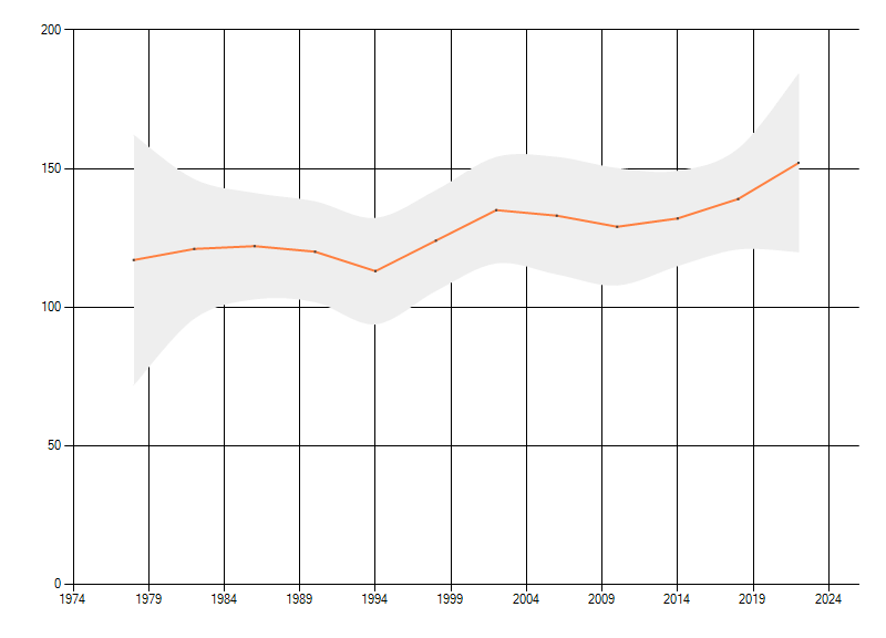 Gemiddelde trend van het aantal kilometerhokken waarin de soort voorkomt, weergegeven als indexcijfer (1975-1978 = 100).