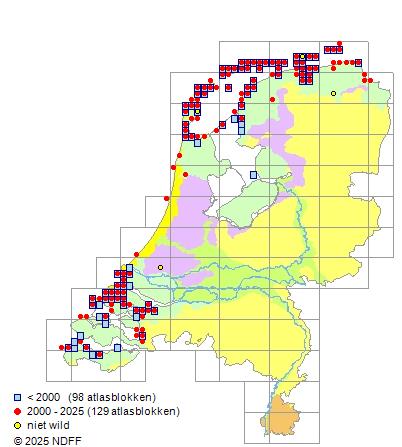 CC BY-NC-SA 3.0 NLVerspreidingNederlandVrij algemeen langs de kust in het Waddengebied, zeldzaam langs de kust van Zeeland en Zuid-Holland en zeer zeldzaam langs de Friese IJsselmeerkust.
