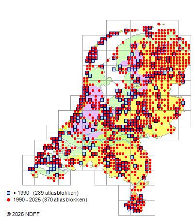 Het aantal atlasblokken (5x5 km) waarin de soort is gemeld binnen een periode van vijf jaar (vanaf 1980) of twintig jaar. Niet gecorrigeerd voor waarnemersinspanning en het aantal doorgegeven waarnemingen kan sterk variëren per periode, dus een trend in verspreiding kan hier niet direct uit worden afgelezen. Het opgegeven jaartal is het eerste jaar van de periode. Bron: gevalideerde waarnemingen uit de NDFF.