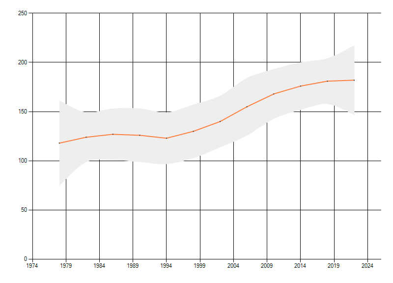 Gemiddelde trend van het aantal kilometerhokken waarin de soort voorkomt, weergegeven als indexcijfer (1975-1978 = 100).