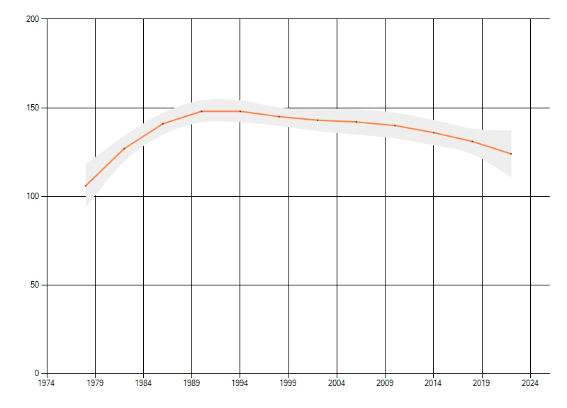 Gemiddelde trend van het aantal kilometerhokken waarin de soort voorkomt, weergegeven als indexcijfer (1975-1978 = 100).