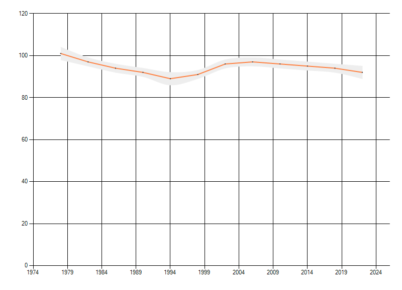 Gemiddelde trend van het aantal kilometerhokken waarin de soort voorkomt, weergegeven als indexcijfer (1975-1978 = 100).