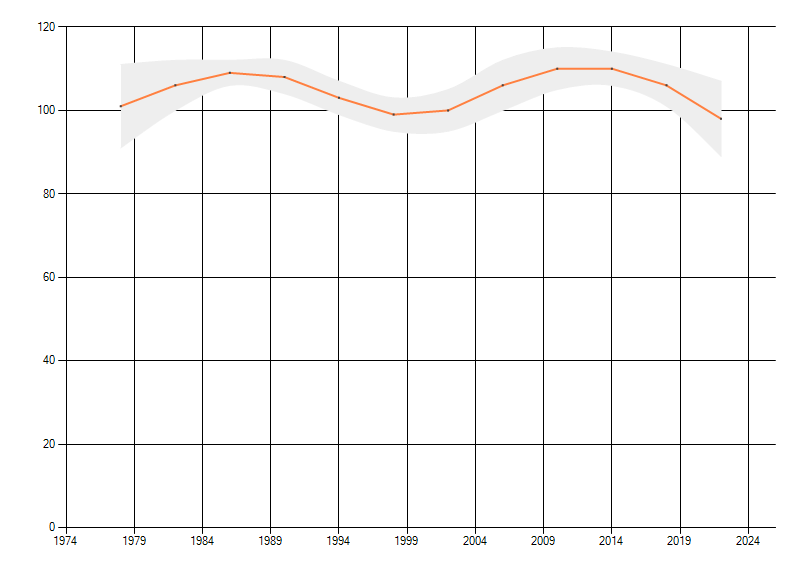 Gemiddelde trend van het aantal kilometerhokken waarin de soort voorkomt, weergegeven als indexcijfer (1975-1978 = 100).
