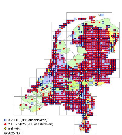 CC BY-NC-SA 3.0 NLVerspreidingNederlandPlaatselijk vrij algemeen in het oosten en midden van het land, in de duinen, op de Waddeneilanden en in laagveengebieden. Zeldzaam in Zuid-Limburg en in het rivierengebied en zeer zeldzaam in zeekleigebieden.