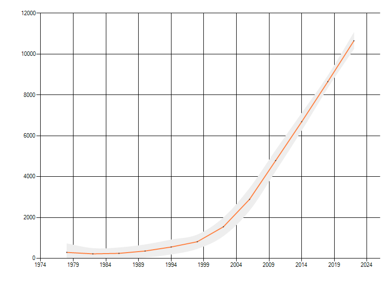 In de grafiek correspondeert ieder punt met het laatste jaar van zo'n periode.