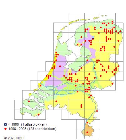 Het aantal atlasblokken (5x5 km) waarin de soort is gemeld binnen een periode van vijf jaar (vanaf 1980) of twintig jaar. Niet gecorrigeerd voor waarnemersinspanning en het aantal doorgegeven waarnemingen kan sterk variƫren per periode, dus een trend in verspreiding kan hier niet direct uit worden afgelezen. Het opgegeven jaartal is het eerste jaar van de periode. Bron: gevalideerde waarnemingen uit de NDFF.