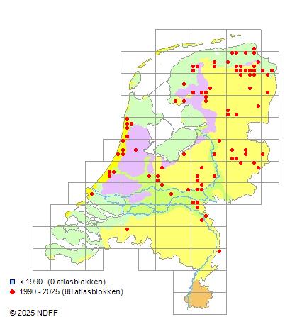 Het aantal atlasblokken (5x5 km) waarin de soort is gemeld binnen een periode van vijf jaar (vanaf 1980) of twintig jaar. Niet gecorrigeerd voor waarnemersinspanning en het aantal doorgegeven waarnemingen kan sterk variëren per periode, dus een trend in verspreiding kan hier niet direct uit worden afgelezen. Het opgegeven jaartal is het eerste jaar van de periode. Bron: gevalideerde waarnemingen uit de NDFF.