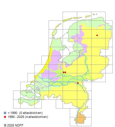 Het aantal atlasblokken (5x5 km) waarin de soort is gemeld binnen een periode van vijf jaar (vanaf 1980) of twintig jaar. Niet gecorrigeerd voor waarnemersinspanning en het aantal doorgegeven waarnemingen kan sterk variëren per periode, dus een trend in verspreiding kan hier niet direct uit worden afgelezen. Het opgegeven jaartal is het eerste jaar van de periode. Bron: gevalideerde waarnemingen uit de NDFF.