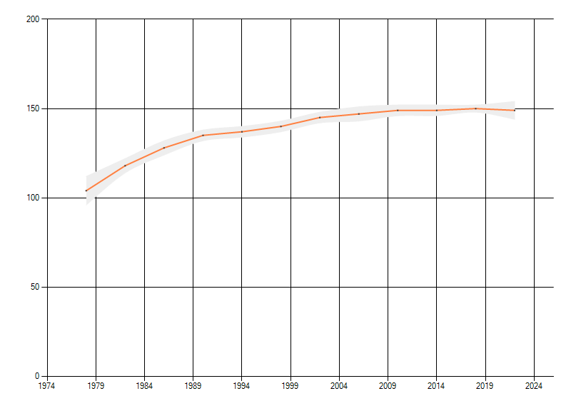 Gemiddelde trend van het aantal kilometerhokken waarin de soort voorkomt, weergegeven als indexcijfer (1975-1978 = 100).