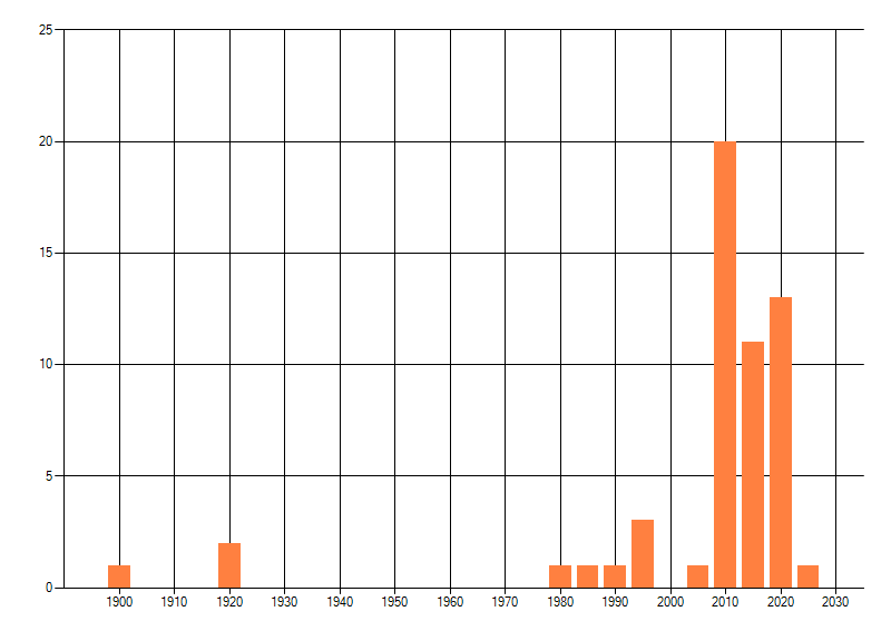 Het aantal atlasblokken (5x5 km) waarin de soort is gemeld binnen een periode van vijf jaar (vanaf 1980) of twintig jaar. Niet gecorrigeerd voor waarnemersinspanning en het aantal doorgegeven waarnemingen kan sterk variëren per periode, dus een trend in verspreiding kan hier niet direct uit worden afgelezen. Het opgegeven jaartal is het eerste jaar van de periode. Bron: gevalideerde waarnemingen uit de NDFF.