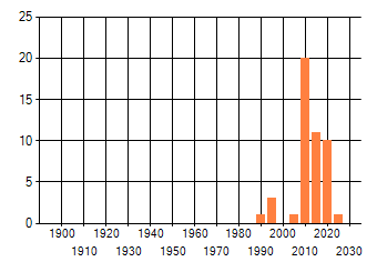 Het aantal atlasblokken (5x5 km) waarin de soort is gemeld binnen een periode van vijf jaar (vanaf 1980) of twintig jaar. Niet gecorrigeerd voor waarnemersinspanning en het aantal doorgegeven waarnemingen kan sterk variëren per periode, dus een trend in verspreiding kan hier niet direct uit worden afgelezen. Het opgegeven jaartal is het eerste jaar van de periode. Bron: gevalideerde waarnemingen uit de NDFF.