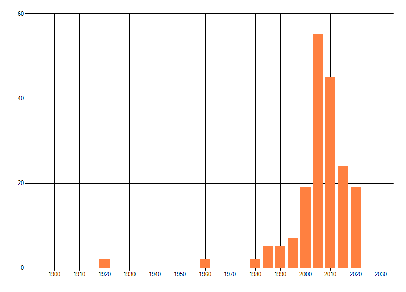Het aantal atlasblokken (5x5 km) waarin de soort is gemeld binnen een periode van vijf jaar (vanaf 1980) of twintig jaar. Niet gecorrigeerd voor waarnemersinspanning en het aantal doorgegeven waarnemingen kan sterk variëren per periode, dus een trend in verspreiding kan hier niet direct uit worden afgelezen. Het opgegeven jaartal is het eerste jaar van de periode. Bron: gevalideerde waarnemingen uit de NDFF.