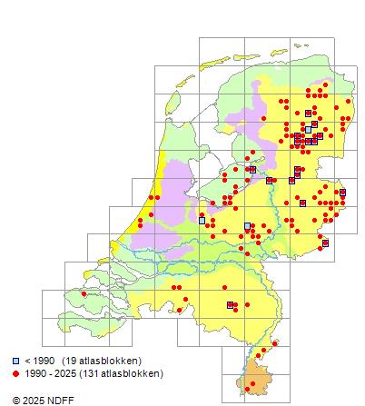 Het aantal atlasblokken (5x5 km) waarin de soort is gemeld binnen een periode van vijf jaar (vanaf 1980) of twintig jaar. Niet gecorrigeerd voor waarnemersinspanning en het aantal doorgegeven waarnemingen kan sterk variëren per periode, dus een trend in verspreiding kan hier niet direct uit worden afgelezen. Het opgegeven jaartal is het eerste jaar van de periode. Bron: gevalideerde waarnemingen uit de NDFF.