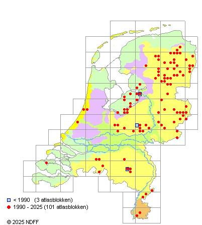 Het aantal atlasblokken (5x5 km) waarin de soort is gemeld binnen een periode van vijf jaar (vanaf 1980) of twintig jaar. Niet gecorrigeerd voor waarnemersinspanning en het aantal doorgegeven waarnemingen kan sterk variëren per periode, dus een trend in verspreiding kan hier niet direct uit worden afgelezen. Het opgegeven jaartal is het eerste jaar van de periode. Bron: gevalideerde waarnemingen uit de NDFF.