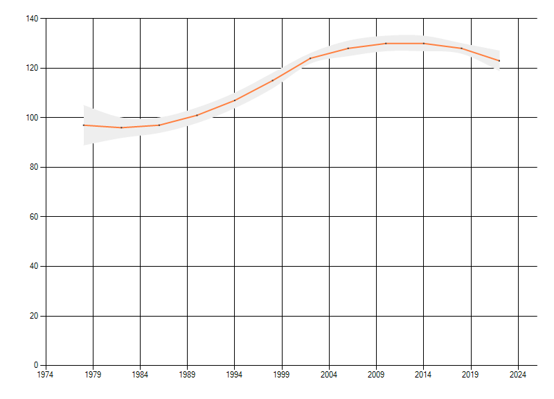 Gemiddelde trend van het aantal kilometerhokken waarin de soort voorkomt, weergegeven als indexcijfer (1975-1978 = 100).