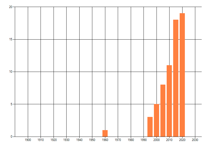 Het aantal atlasblokken (5x5 km) waarin de soort is gemeld binnen een periode van vijf jaar (vanaf 1980) of twintig jaar. Niet gecorrigeerd voor waarnemersinspanning en het aantal doorgegeven waarnemingen kan sterk variëren per periode, dus een trend in verspreiding kan hier niet direct uit worden afgelezen. Het opgegeven jaartal is het eerste jaar van de periode. Bron: gevalideerde waarnemingen uit de NDFF.